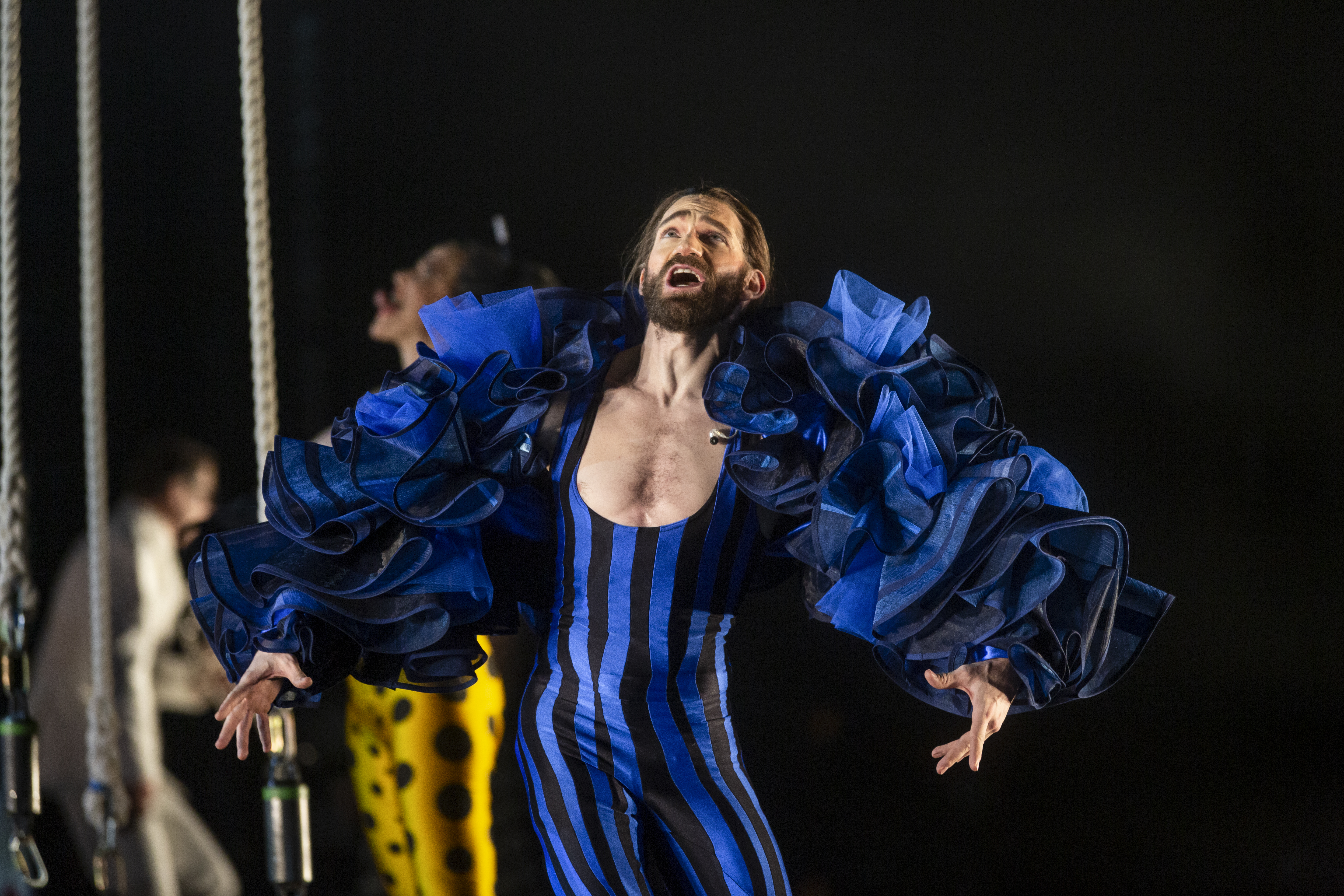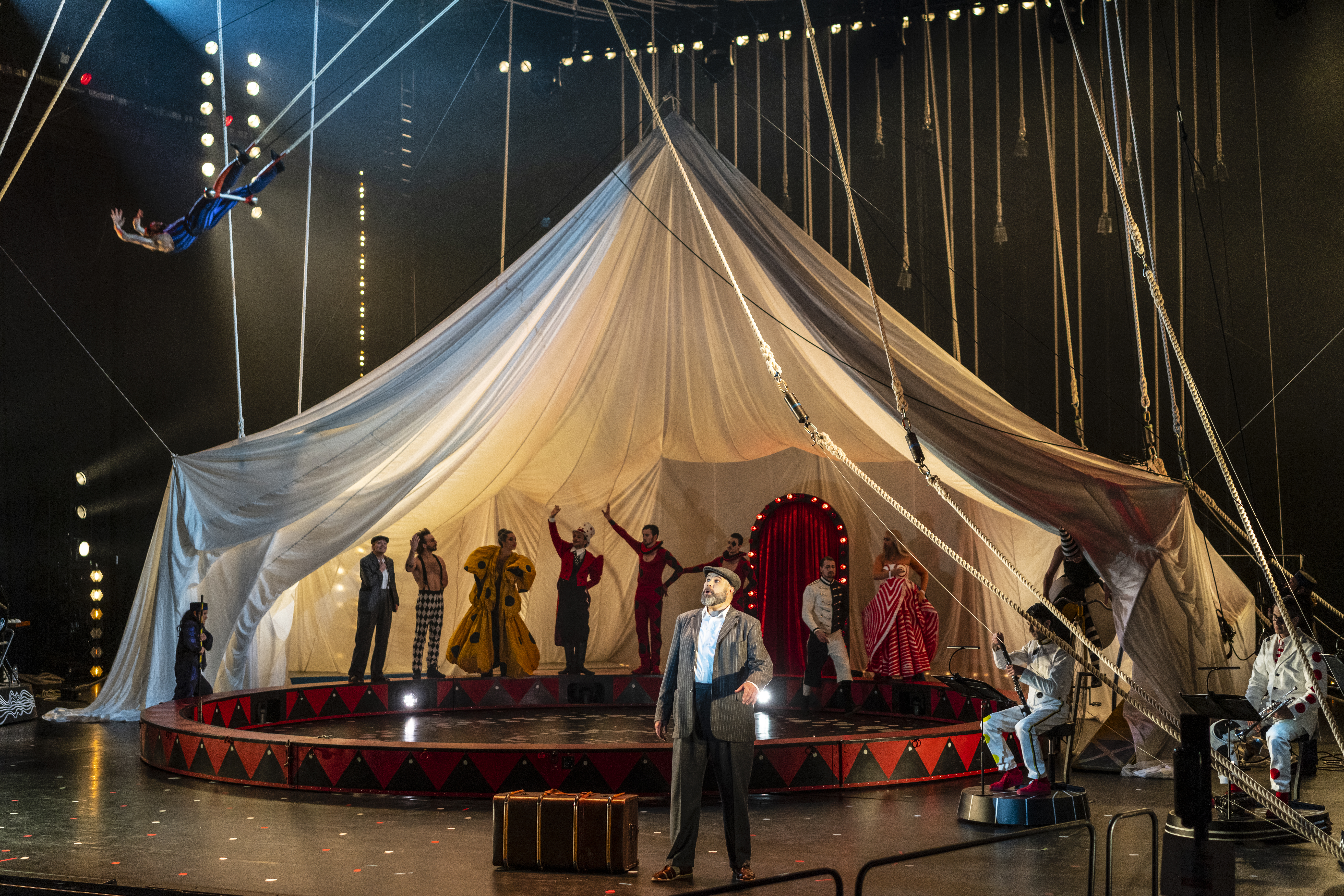 Lax F, the poet as a young man - Elin Rombo (vänster); Lax M, the old poet - Jakob Högström (höger). På trampolinen: Youngest son of the Cristianis - Andreas De Ryck (i luften); Second son of the Cristianis - Aaron Hakala (på brädan); Enrico Rastelli, a circus artist - Peter Åberg (på brädan, i vitt); cirkusartister, sångare och musiker.