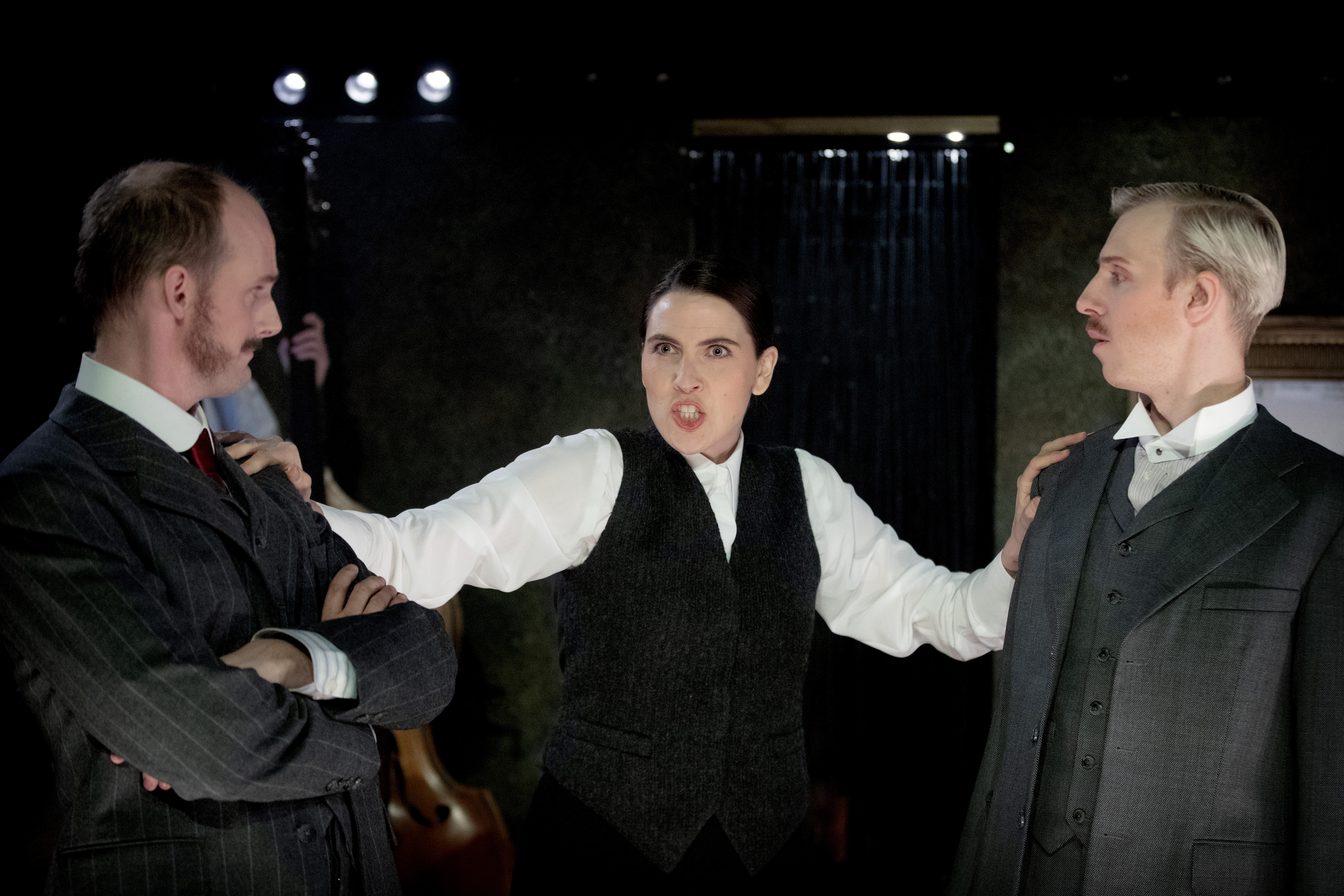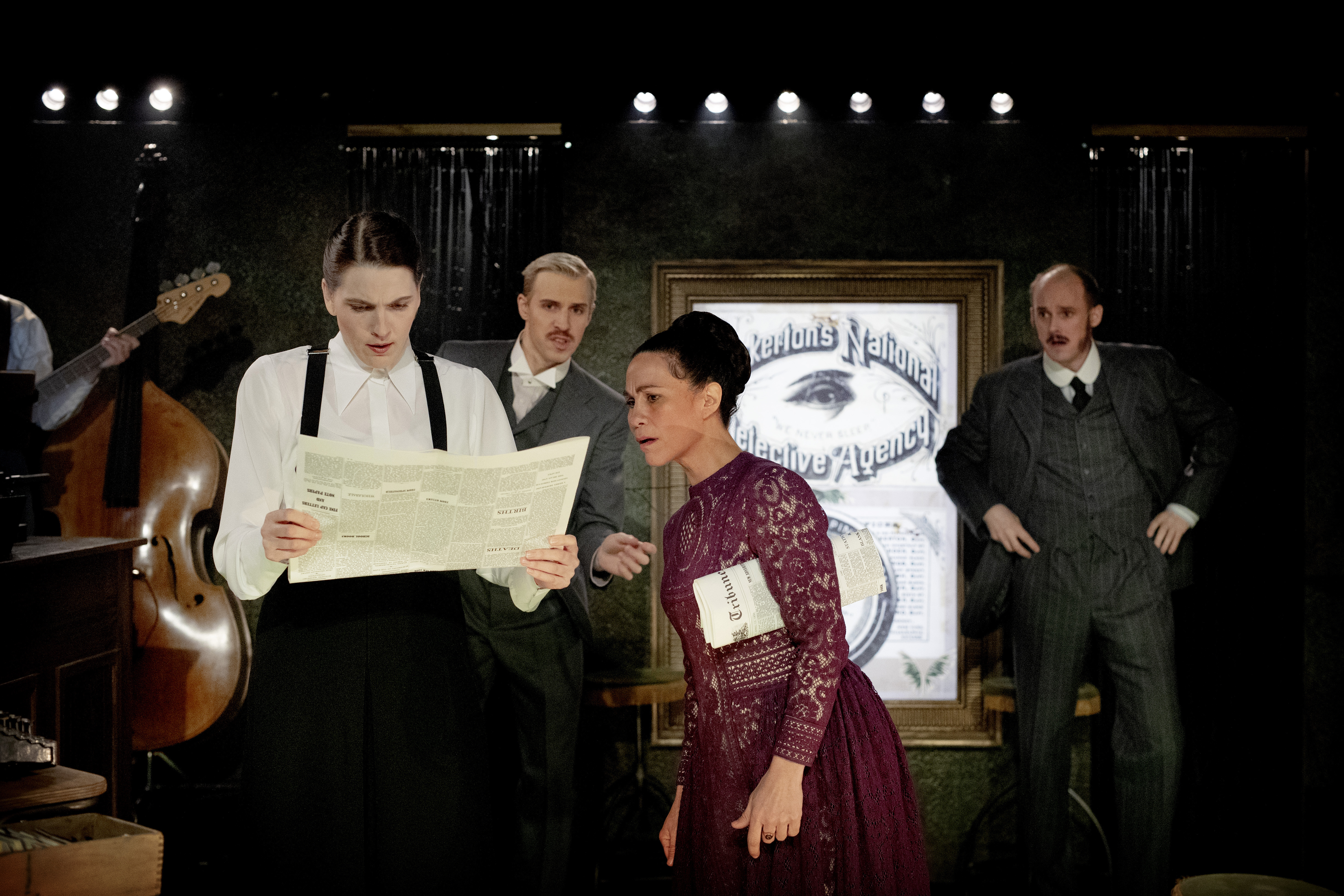 Kate Warne - Sara Lehmann; Goodliver - Miriam Aïda. I bakgrunden: Jeff Pinkerton - Oscar Pierrou Lindén; Allan Pinkerton - Jonas Schlyter.
