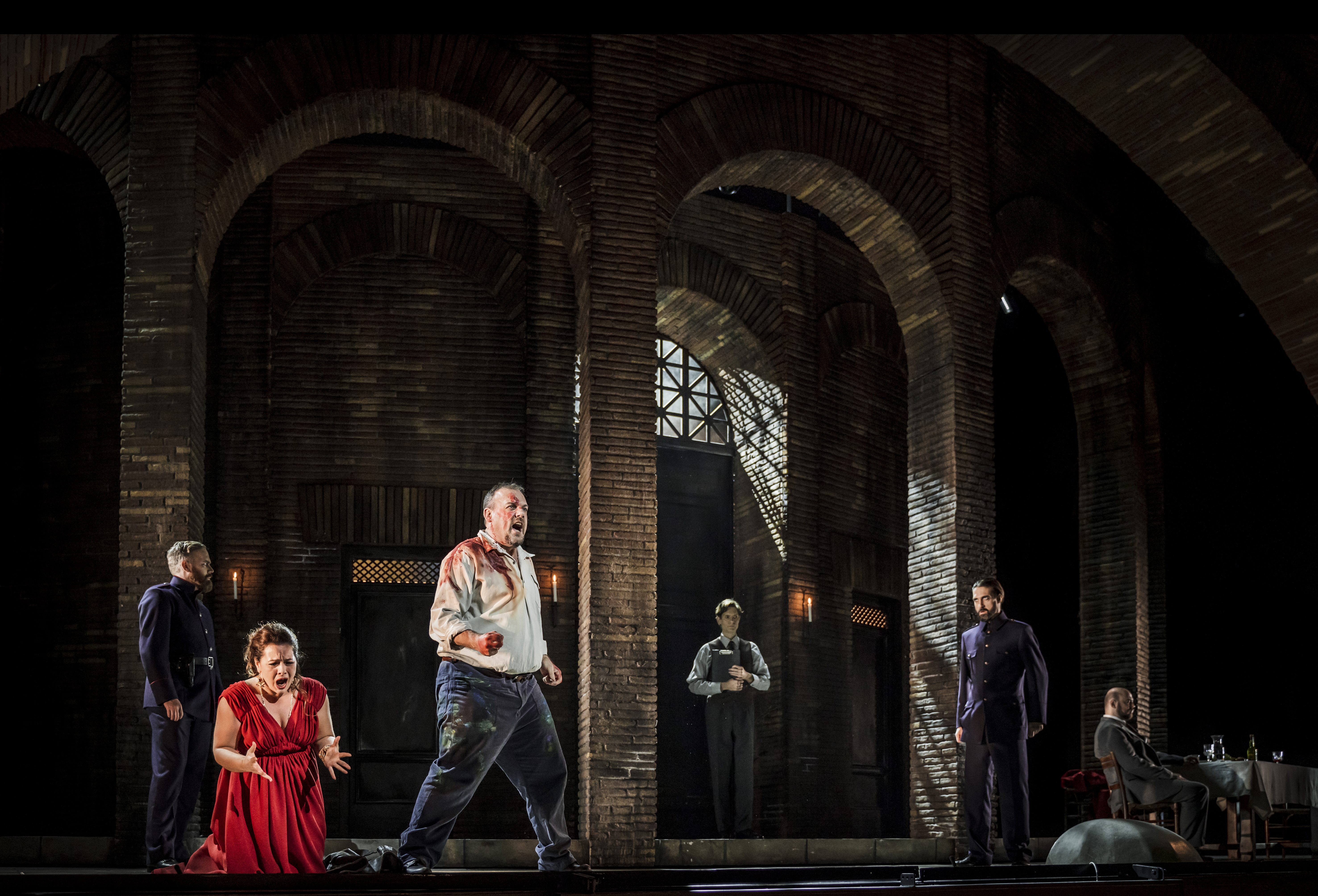Tosca - Lianna Haroutounian; Cavaradossi - Dimitris Paksoglou; Scarpia (sittande) - Vladislav Sulimsky. I bakgrunden: Fångvaktare - Andreas Paulsson; Fångvaktare - Tobias Nilsson; Sciarrone - Eric Roos